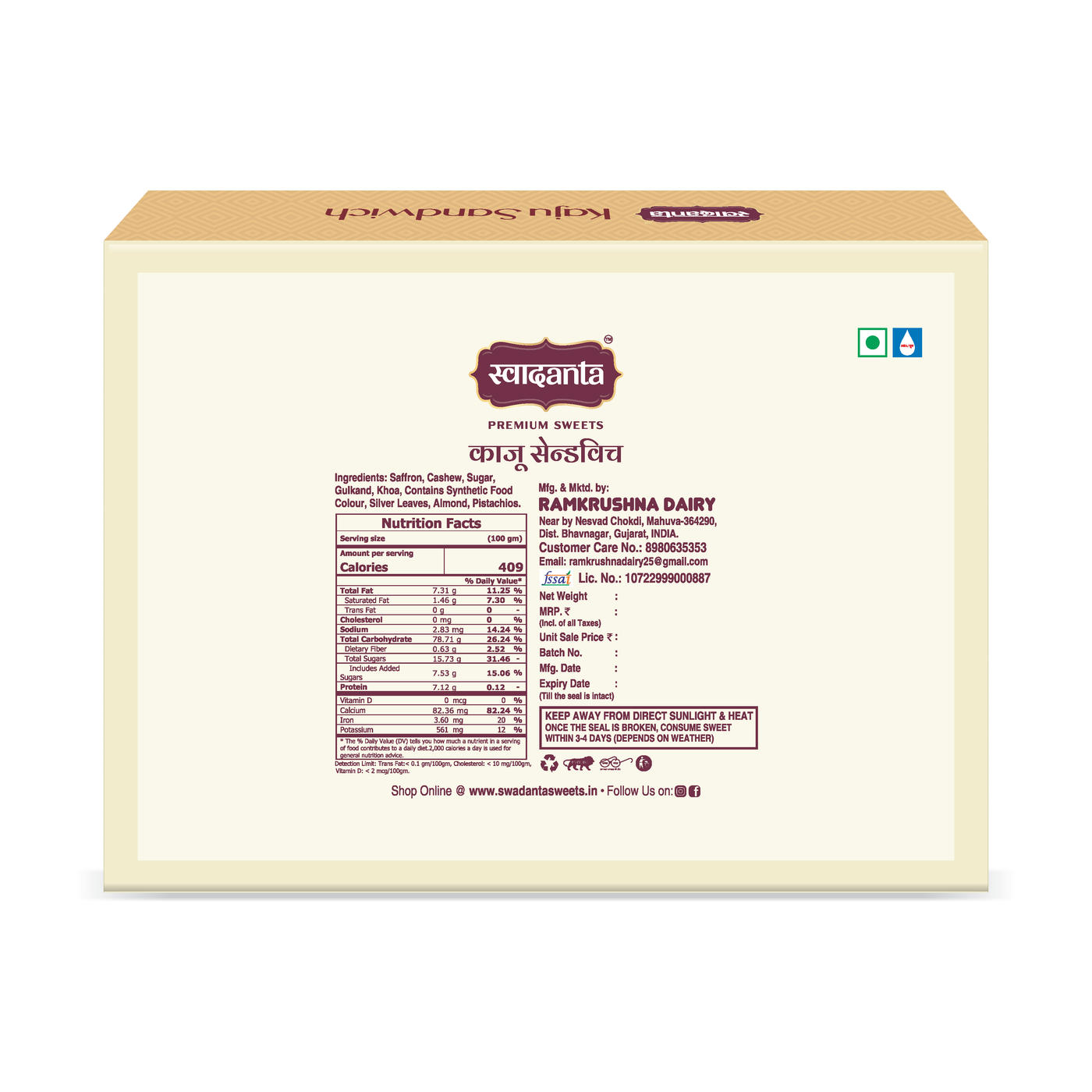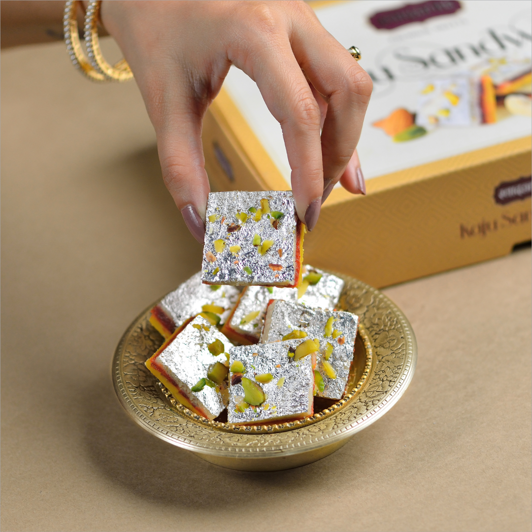 Ingredients: Saffron, Cashew, Sugar, Gulkand, Khoa, Contains Synthetic Food Color, Silver Leaves, Almond, Pistachios