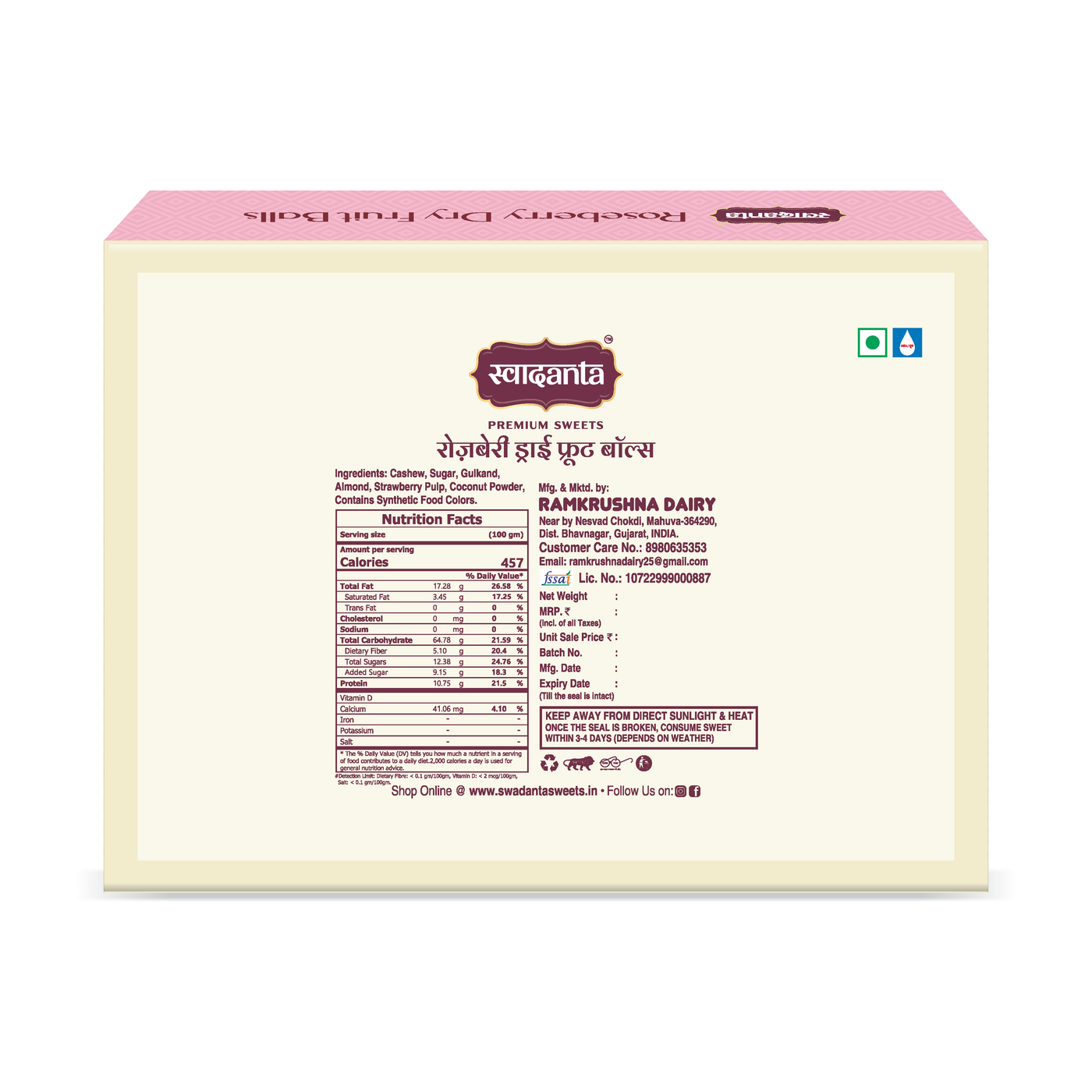 Ingredients: Cashew, Sugar, Gulkand, Almond, Strawberry Pulp, Coconut Powder, Contains Synthetic Food Colors